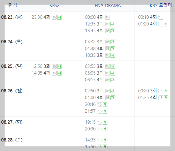4회 재방송은 8월 23일 00시 10분 KBS 드라마 채널, 00시 00분 ENA DRAMA 채널, 23시 30분에 KBS2 채널에서 보실 수 있습니다.